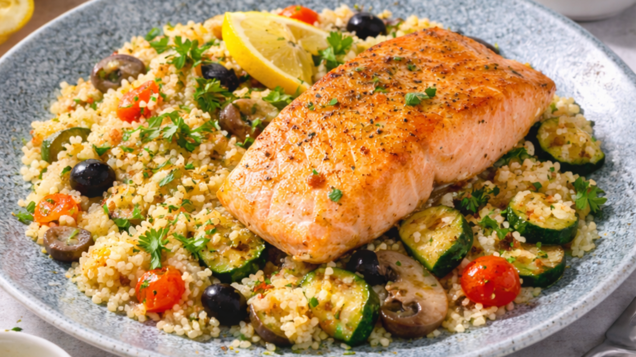 Cuscús al limón con calabacín, champiñones y salmón